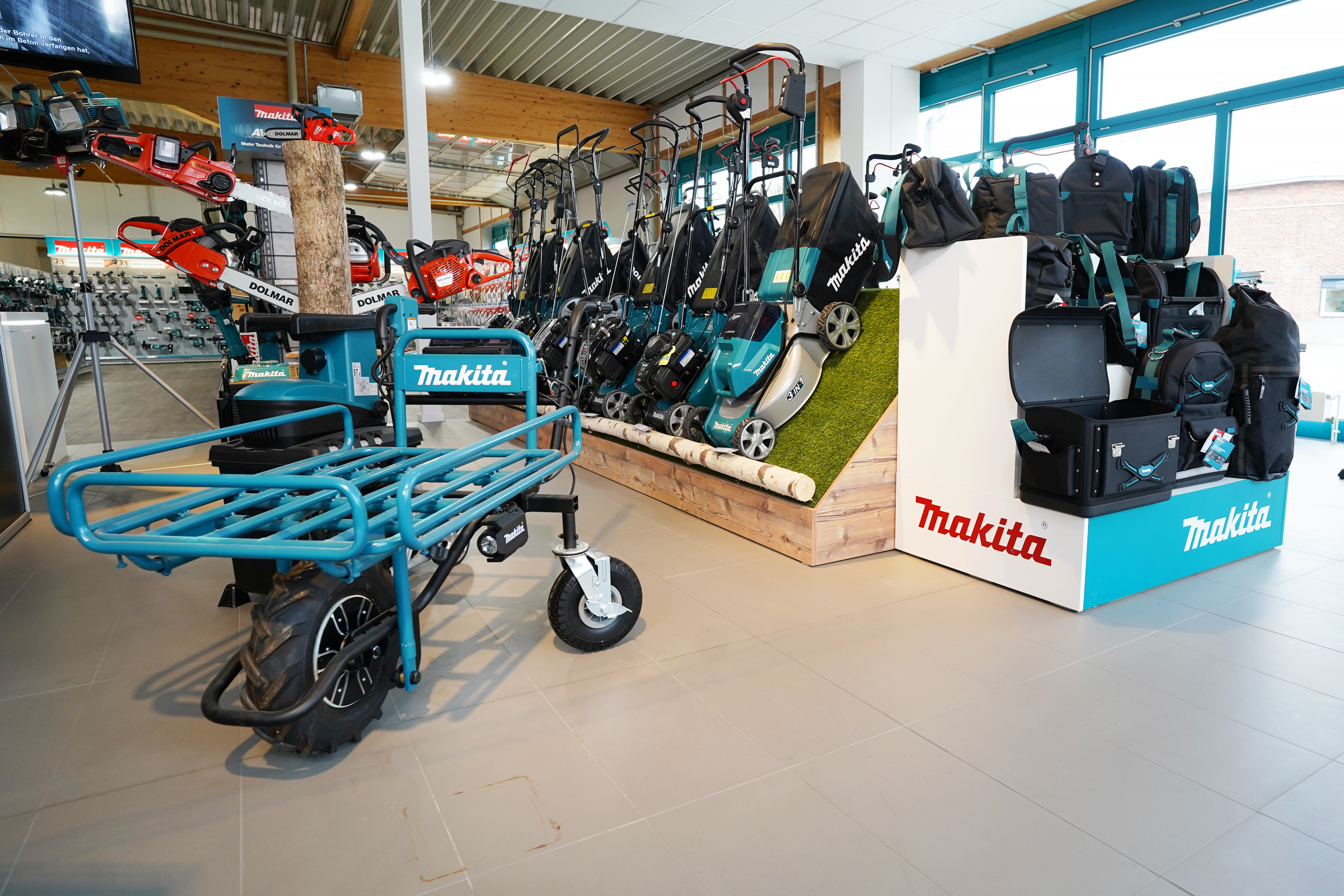 Das Makita Service-Center vereint auf 800 m² einen großzügigen Showroom sowie Schulungsräumlichkeiten und auch eine Reparaturwerkstatt zentral in Berlin. Im weitläufigem Showroom finden interessierte Kunden das komplette Makita Produktportfolio inklusive der Marke Dolmar. Mit über 320 verschiedenen Akku-Werkzeugen und Gartengeräten wird hier eine große Auswahl geboten. Hinzu kommt ein umfangreiches Zubehör-Sortiment mit über 1500 Artikeln vor Ort.