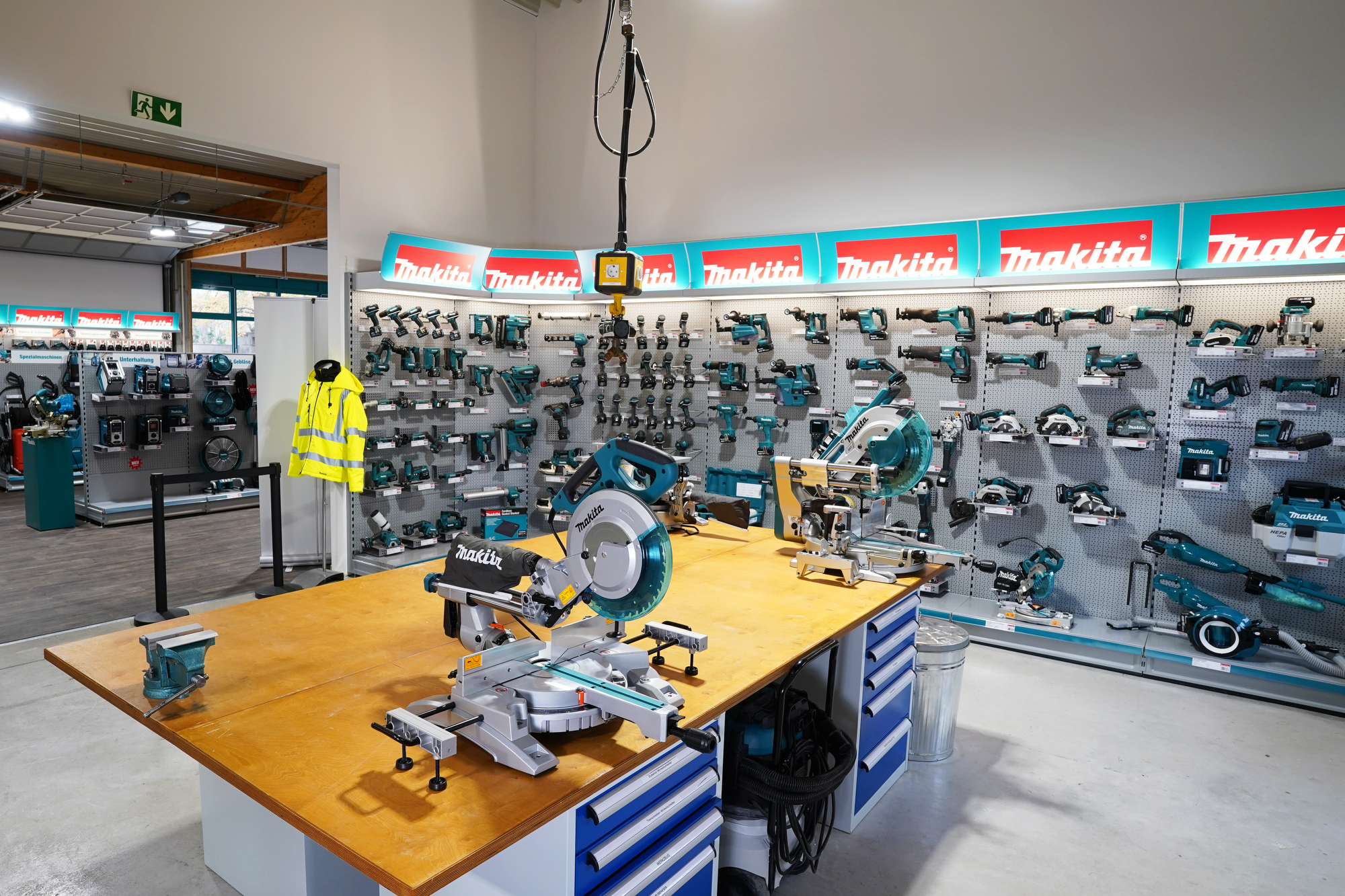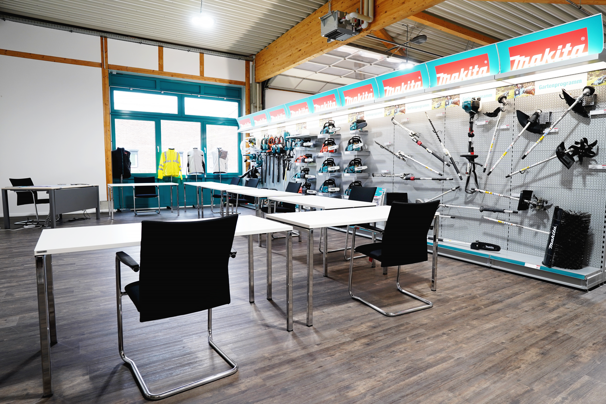 In dem separaten Seminarbereich finden regelmäßig Schulungen für unsere Makita Fachhandelspartner statt. Teilnehmer können sowohl im Seminarraum ihre theoretischen Kenntnisse vertiefen, als auch im angeschlossenen Testbereich selbst zur Maschine greifen und diese ausgiebig ausprobieren. Die Schulungen richten sich an Mitarbeiter unserer Fachhandelspartner sowie professionelle Anwender. Bei Interesse kontaktieren Sie bitte das Service-Center Team.